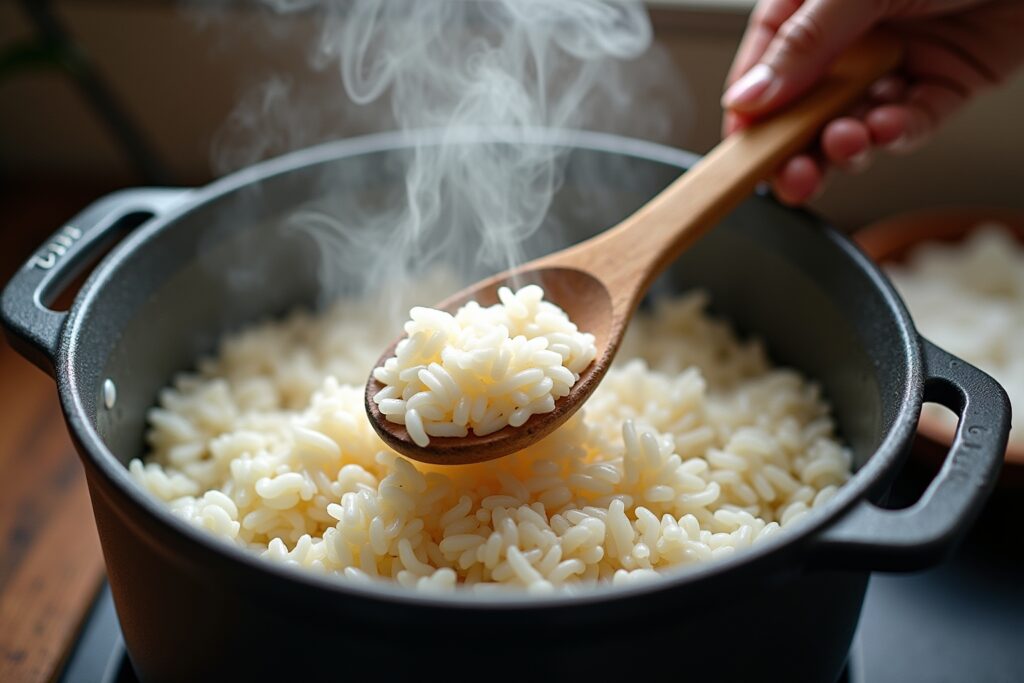 Achte darauf, den Reis vor dem Kochen gründlich zu waschen, das richtige Verhältnis von Reis und Wasser zu verwenden und den Reis nur gelegentlich umzurühren.